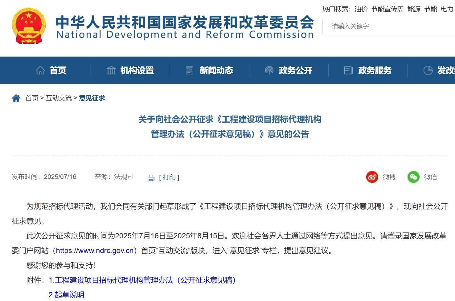 為規(guī)范招標(biāo)代理活動(dòng),國(guó)家發(fā)展和改革委員會(huì)會(huì)同有關(guān)部門起草形成了《工程建設(shè)項(xiàng)目招標(biāo)代理機(jī)構(gòu)管理辦法(公開征求意見稿)》,現(xiàn)向社會(huì)公開征求意見。此次公開征求意見的時(shí)間為2025年7月16日至2025年8月15日。